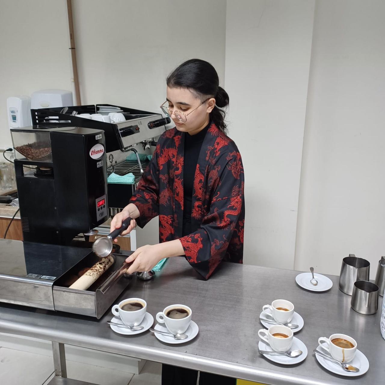A prova de barista envolve o manuseio correto da máquina de café expresso e o preparo de cafés clássicos e especiais, como o Irish Coffee, com modo de preparo diferente. Além disso, cada competidor deve criar um drink alcoólico à base de café. “Antes eu não tinha conhecimento nenhum sobre café, aprendi tudo no treinamento. Hoje vejo a bebida de forma diferente”, comenta Emanoela.