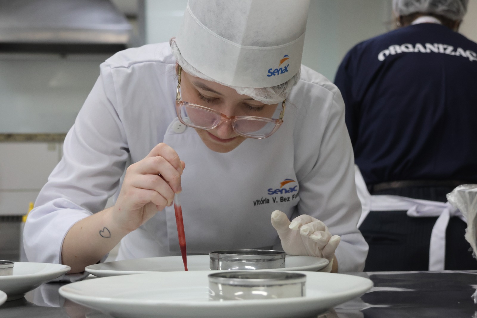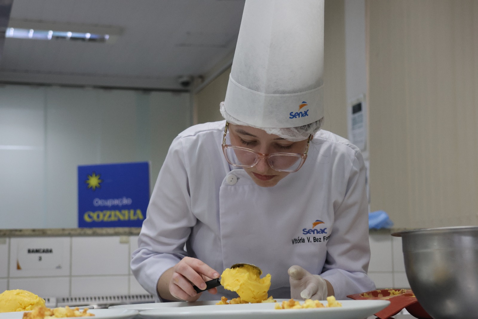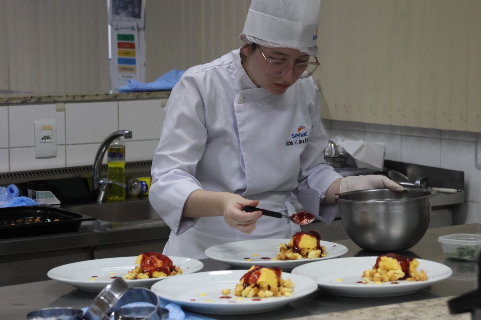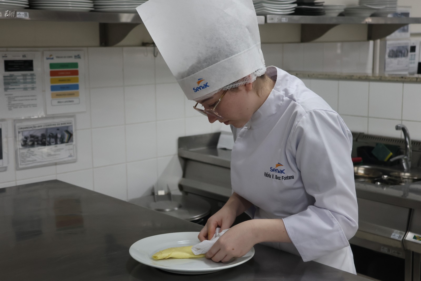Desde fevereiro, a rotina da criciumense Vitória Vieira Bez Fontana, 21 anos, representante de Santa Catarina na ocupação Cozinha nas Competições nacionais do Senac, tem sido intensa. “Fico uma ou duas semanas por mês em Joinville e o restante em Criciúma.” Com 8 anos, a menina que gostava de ver a avó cozinhar, já tinha planos: “Eu sempre falava que iria abrir um hotel com um restaurante, para que eu pudesse receber as pessoas. Então o tempo foi passando e fui pesquisando mais sobre a cozinha. Me interessei muito mais quando eu soube que tinha faculdade disso e com 17 anos quis fazer o curso.”